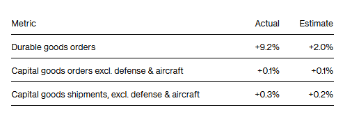 与可随时取消的订单不同,政府统计GDP时采用实际出货量数据(反映已支付交易)。修正后的核心资本品出货量增速由0.7%放缓至0.3%。