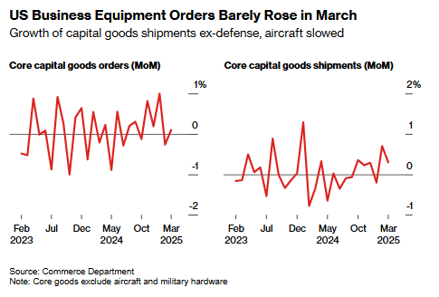 3月,美国工厂收到的商业设备订单几乎没有增长,这表明在关税和税收政策的不确定性下,企业变得越来越谨慎。
